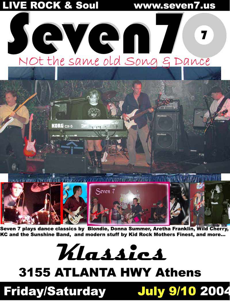Athens live dance party music is our business.  Wedding parties frat parties or sororities and all types of private and public occasions.  All music, lyrics, and references to the same are the copyrights and or registered trademarks of their respective owners.  Please notify us of any potential unintended infringement thereof.  Send mail to booking@seven7.us with questions or comments about this web site.  This site designed, hosted, marketed, and supported by John KirschMusic recorded, stored, and  streamed by John Kirsch.   All content including but not limited to HTML, ASP, JavaScript, VBScript, music video, and  graphics Copyright © 2002, 2003, 2004, 2005, 2006, 2007,  2008, 2009, 2010, and 2011 John Kirsch web design.   This site is optimized 4 Microsoft's media player.  We appreciate Google's high ranking.  Enjoy Atlanta and Athens best dance music, funk music, and disco wedding music 80s band.  No booking agent, booking agency and/or booking angencies' fees are required or paid when you book Atlanta's seven 7 wedding band online.  Call 706-351-0224 (local Athens, GA call) for the best live music entertainment in Georgia. Seven 7 is Georgia's Cover Band